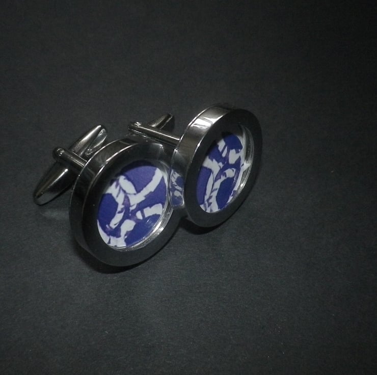 This listing is part of a programme of cufflinks made in my design studio in southern England..... images include graphic art, movies & music, animals & birds, sport,& romance, plus a wide variety of other themes, all chosen for their vibrancy and visual impact......The cufflinks are crafted from rhodium plated alloy, are highly polished with a deep setting and cigar shaped shank for ease of use .