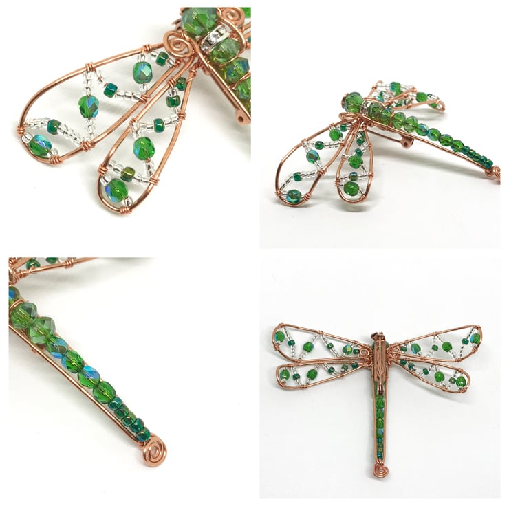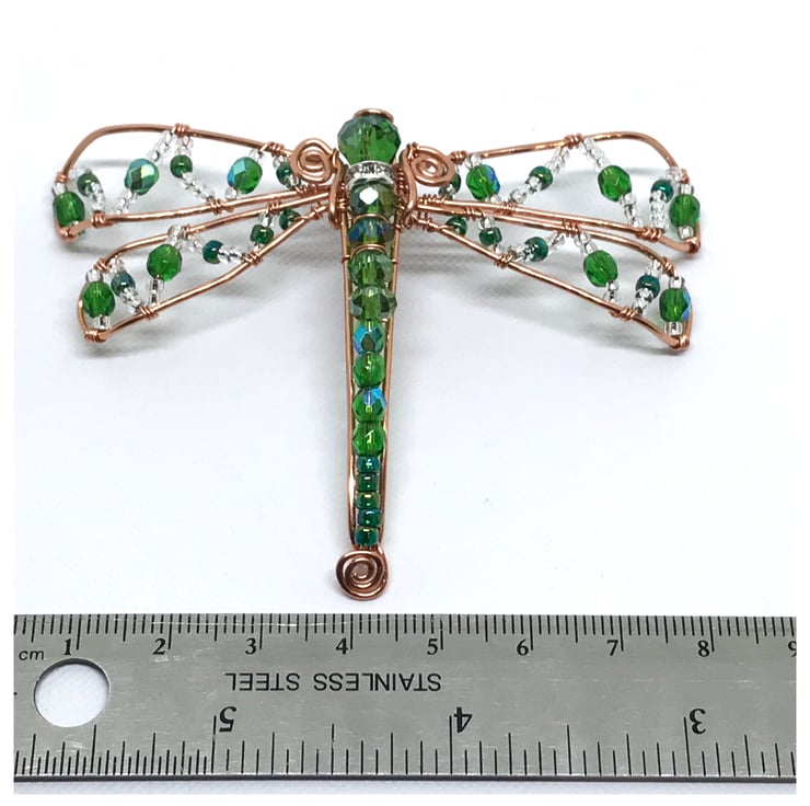 I have formed copper wire into a dragonfly shape. For the wings I have wrapped silver lined crystal and iridescent green seed beads with beautiful green fire polished Czech crystal beads around the wings in a zig zag weave design. The body of the dragonfly has graduated fire polished green Czech crystal beads, 6mm and 4 mm, together with green seed beads and a sparkling rhinestone spacer bead. The top and tail of the dragonfly are finished with a swirl of copper. The dragonfly body is attached to the wings and onto a copper brooch back with safety clasp.