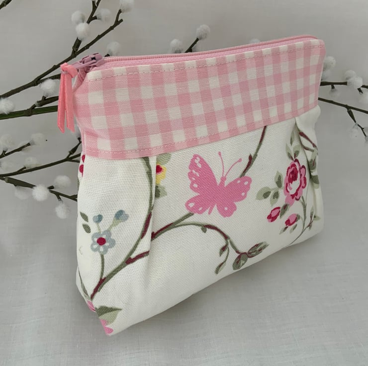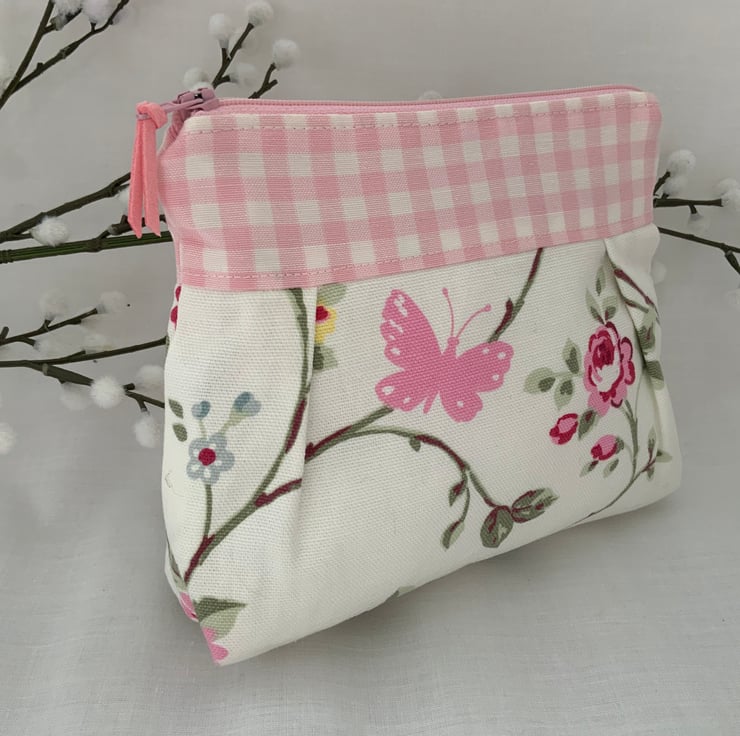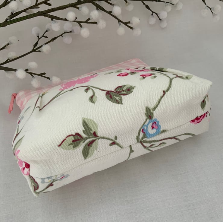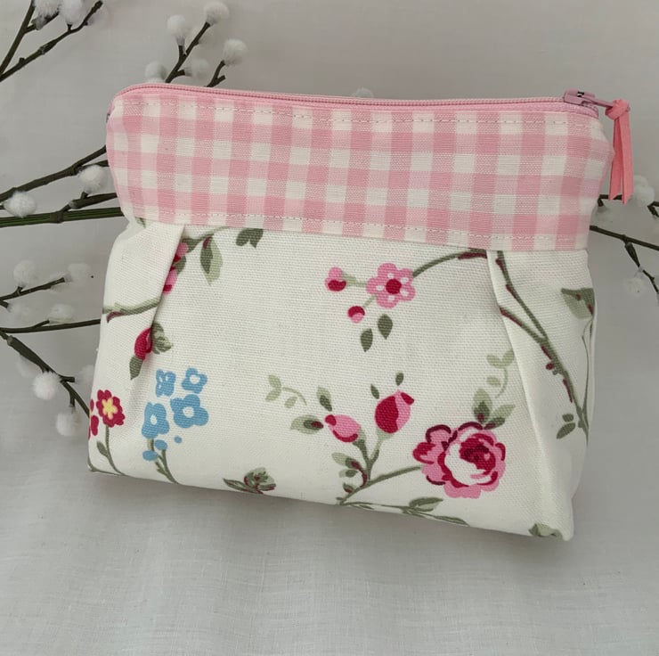 Pretty pleated zipped cosmetic purse / make up bag and matching tissue holder. Made from 100% cotton combining pink gingham and floral fabric. It is lined with cream cotton with bonded interlining which gives it a little structure.