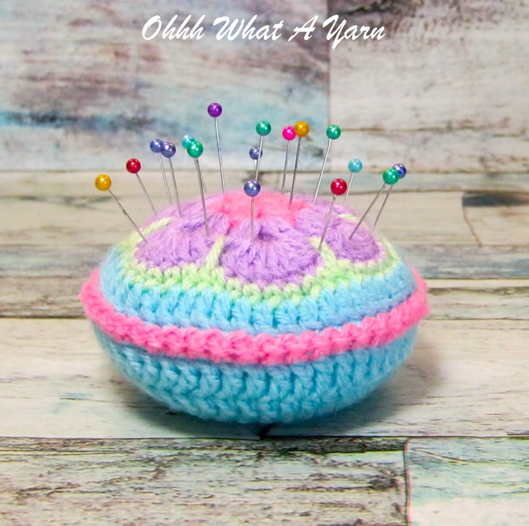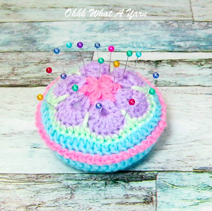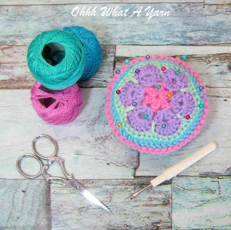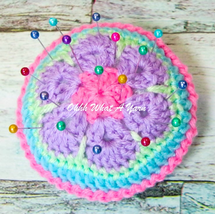 This pretty African violet floral pin cushion is crocheted using 100% acrylic yarns in gorgeous pastel shades.