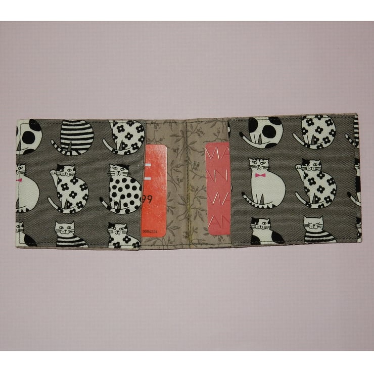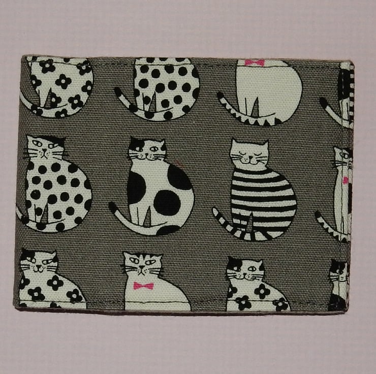 This is one for the cat lovers, (like me) a fun hand made wallet, ideal for travel cards, Oyster cards, bus pass, train tickets or even credit cards. It measures approx. 3.5 x 3 inches folded and 7.5 inches open. It is made from linen effect fabric featuring black and white cats on a grey background, and is lined in toning fabric.