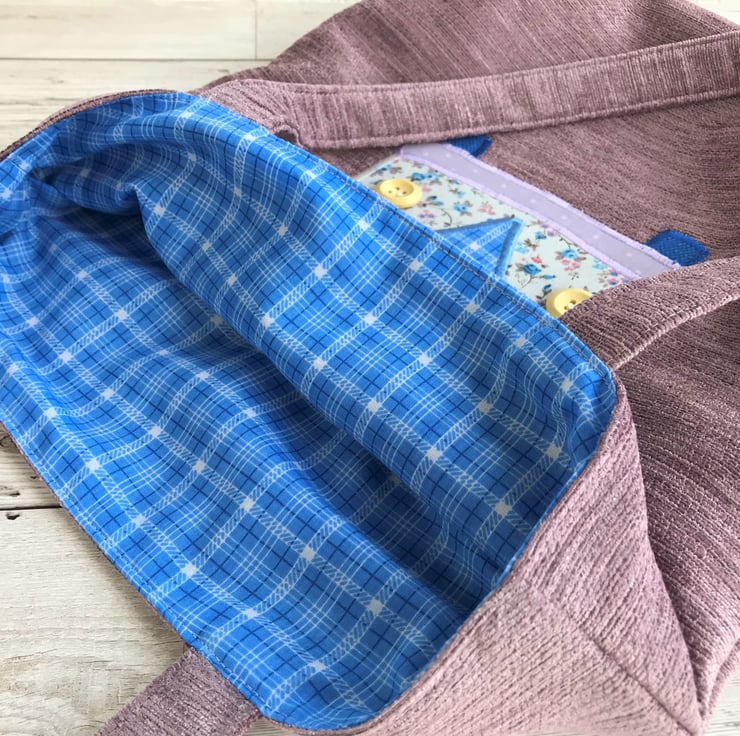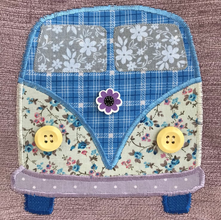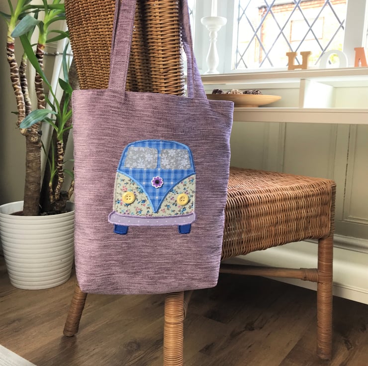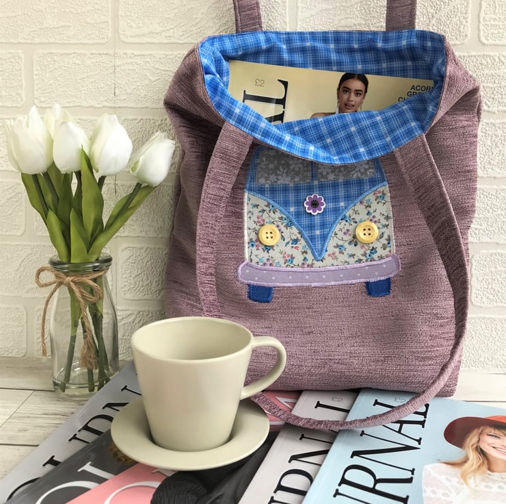A fun campervan tote bag in a lovely textured pink/lilac fabric with an appliqué campervan. The campervan resembles a vintage VW campervan and is made from a variety of co-ordinating floral and checked fabrics. The upper part of the van is blue with a white and dark blue checked pattern. The lower part is cream with a ditsy floral pattern in shades of blue, lilac and pink. The bumper is lilac with white polka dots. The windscreen windows are pale grey with white flowers, and are edged with silver metallic thread. I've used two pale wooden buttons for the campervan headlights. For the badge on the front, I've used a purple wooden flower shaped button. The bag is fully lined with blue check fabric which matches upper campervan fabric.