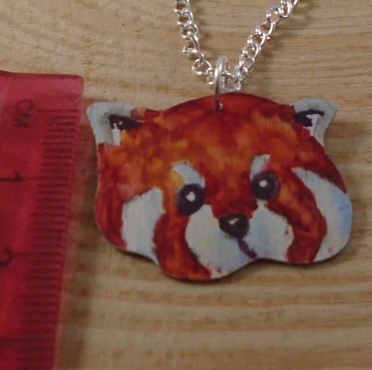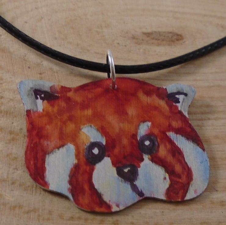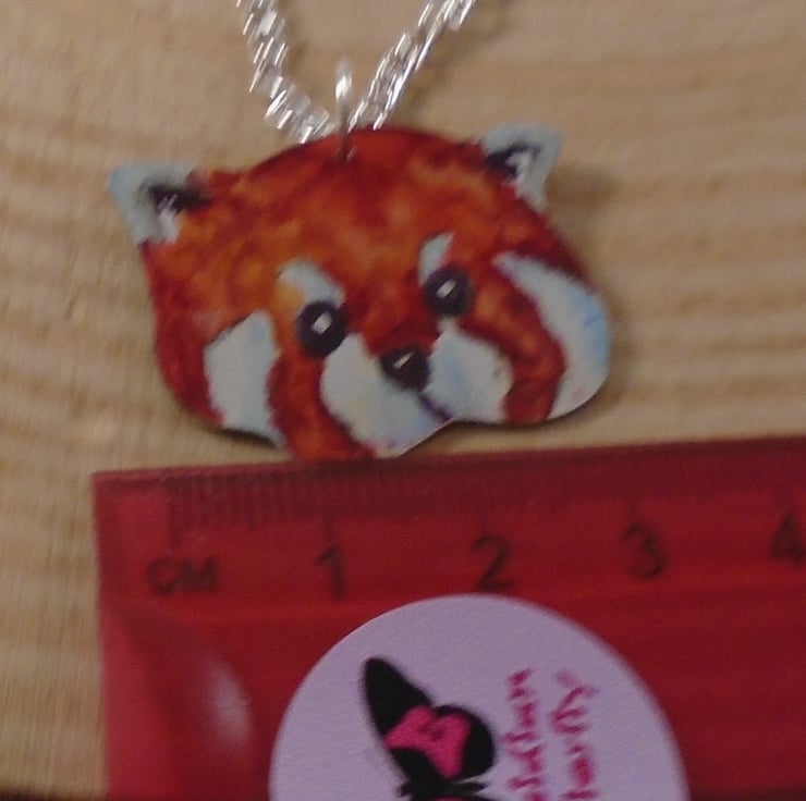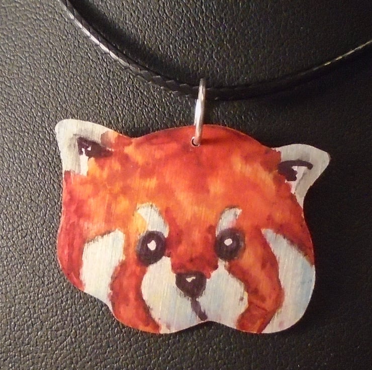 A cute red panda necklace, hand made from anodised aluminium. The shape of the red panda head has been hand cut from a sheet of aluminium. It has then been hand drawn and dyed in a watercolour style. A hole has then been drilled in the top for a loop for a chain.