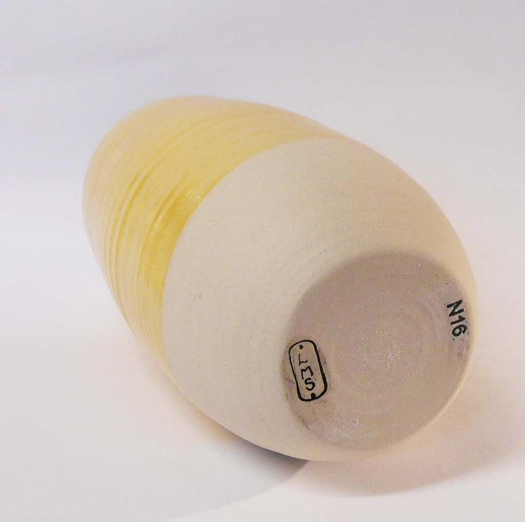 This is a wheel thrown durable stoneware Vase. It has been glazed on the inside with shiny Tin white glaze, and the outside has a Sunflower yellow glaze painted across the body.