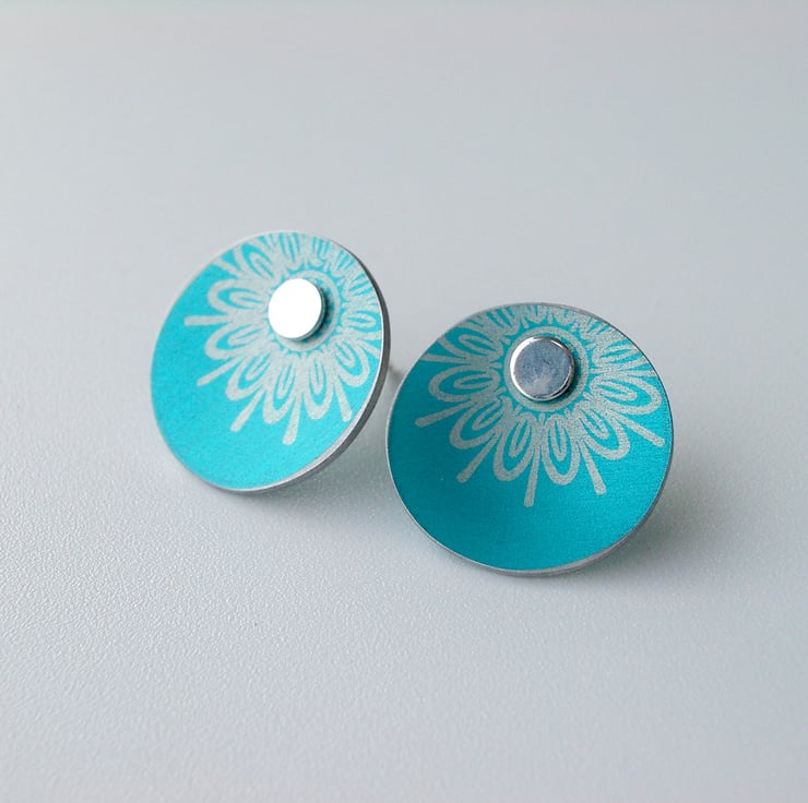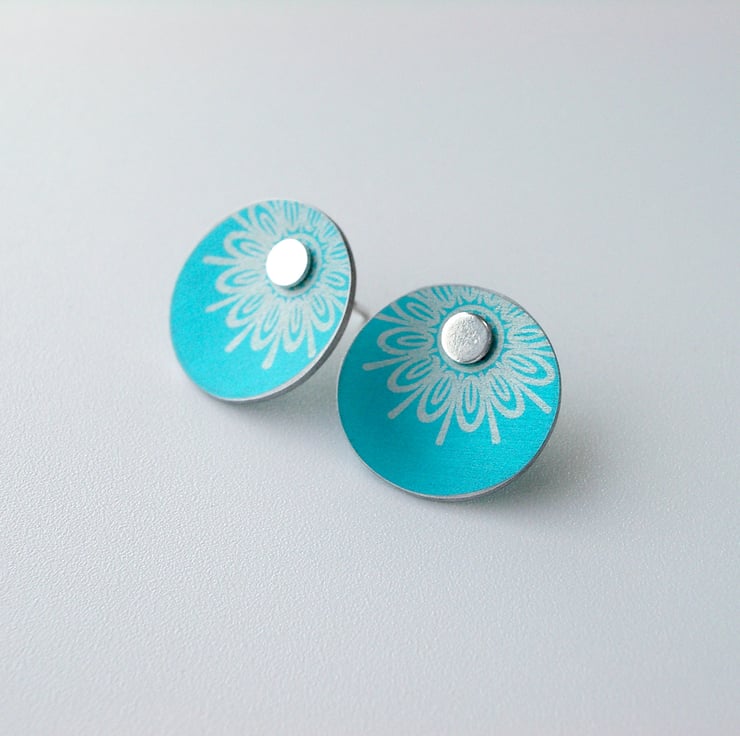 These delicate flower print earrings are handmade from aluminium which I have dyed in a lovely turquoise colour and printed with a pretty flower design. The dye is sealed in so that it is permanent and I have cut out the disc shape and filed it all by hand. I have domed the discs so that they have a subtle concave appearance. Finally, I've drilled holes for the sterling silver studs to feed through. It's not possible to solder aluminium so the studs are held onto the ear by pressure from the butterfly at the back.