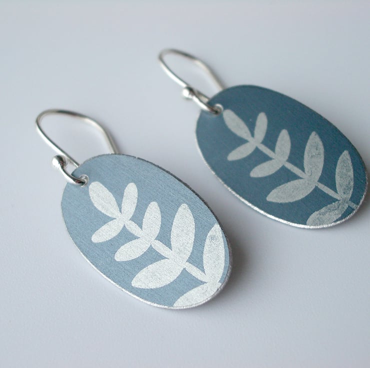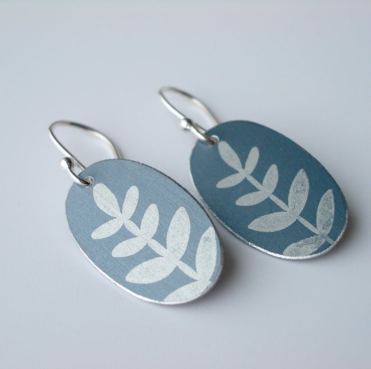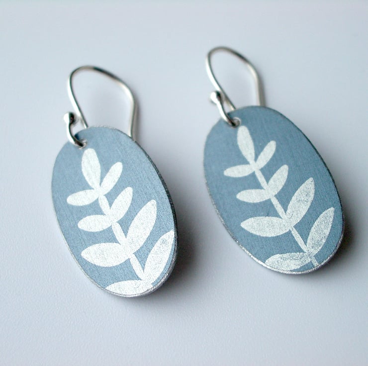 These oval earrings are made from aluminium which I have dyed in grey and printed with a silver leaf print. I make the dye permanent through heat and cut out the oval shape by hand using a piercing saw filing the edges to reveal the shiny silver aluminium underneath the dye.