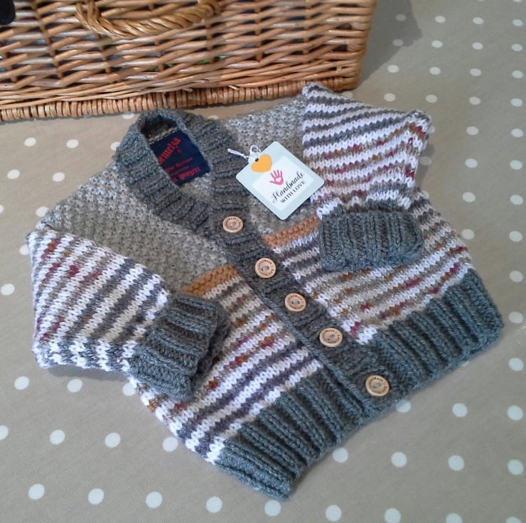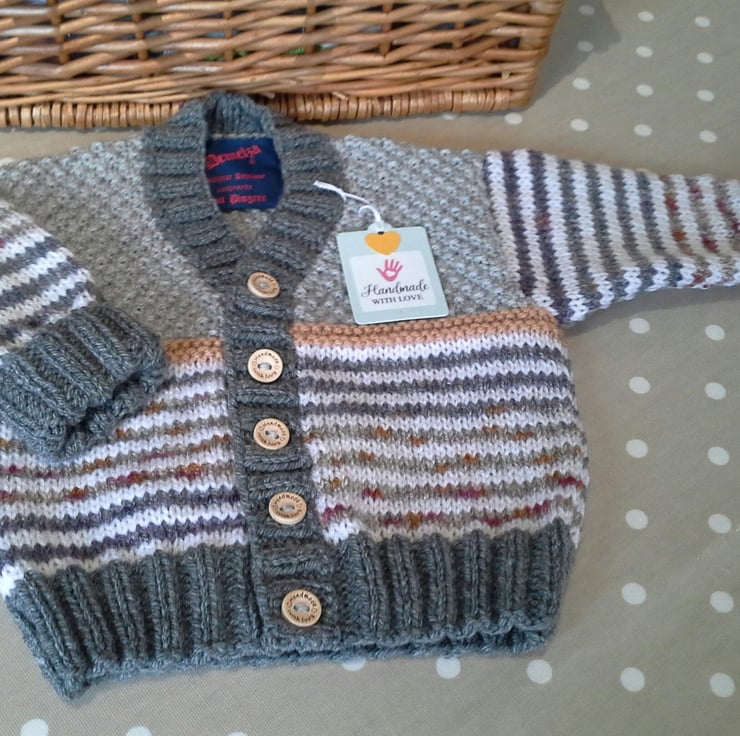 This unique hand knitted baby cardigan has been lovingly designed and made in Cornwall using quality branded machine washable British and French manufactured yarns. The buttons are made from genuine wood with a loving sentiment burnt etched on them. The multicoloured yarn has a 30% merino wool content for added luxury and warmth.