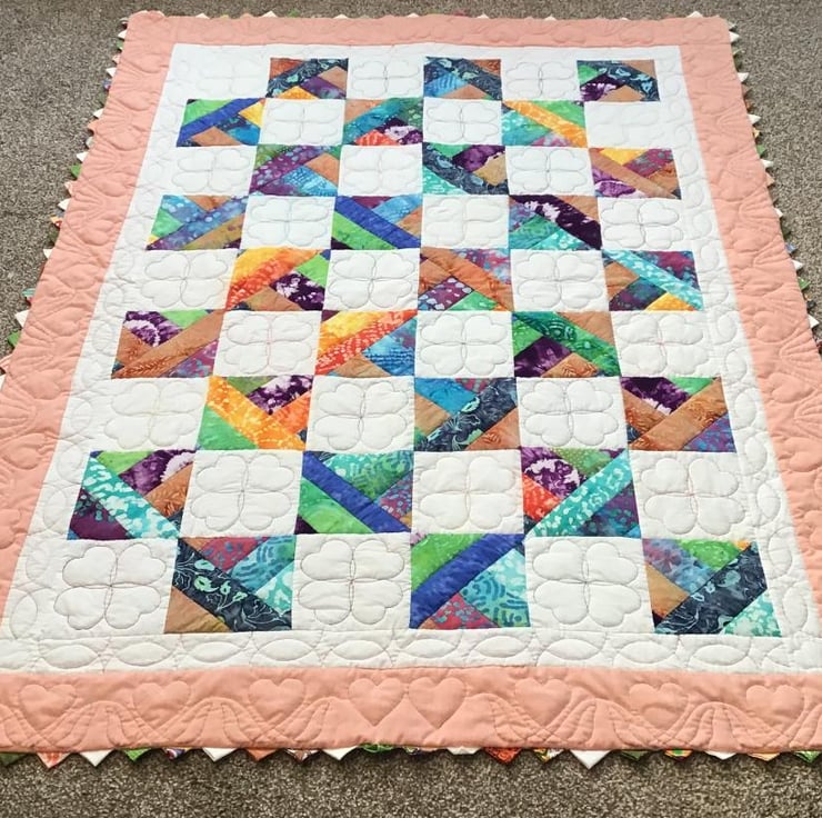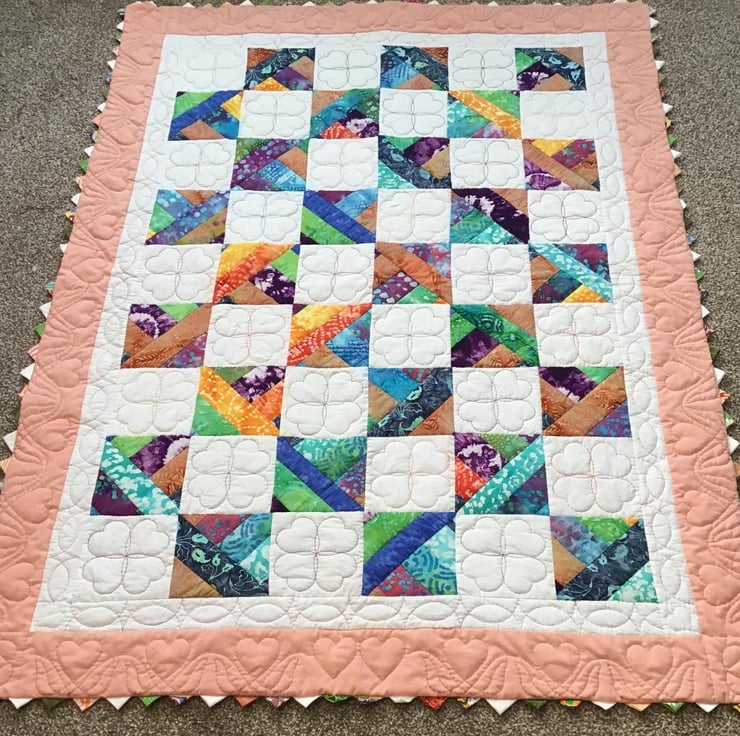 This quilt is very colourful, made up of Batik cotton fabric in a rainbow of colours and white tone on tone cotton fabric. In the white squares I have hand quilted hearts to make a flower shape. The border is peach cotton fabric and edged with different coloured prairie points.