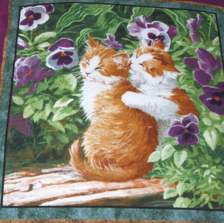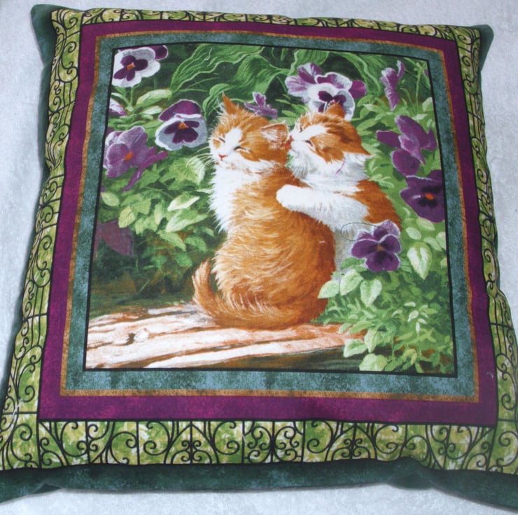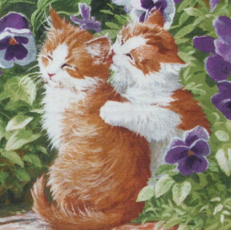 Two pretty ginger and white kitties sitting on a garden seat among the pretty pansies cushion, one of them is giving the other one a good wash and brush up !