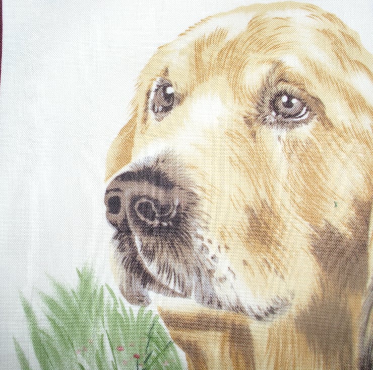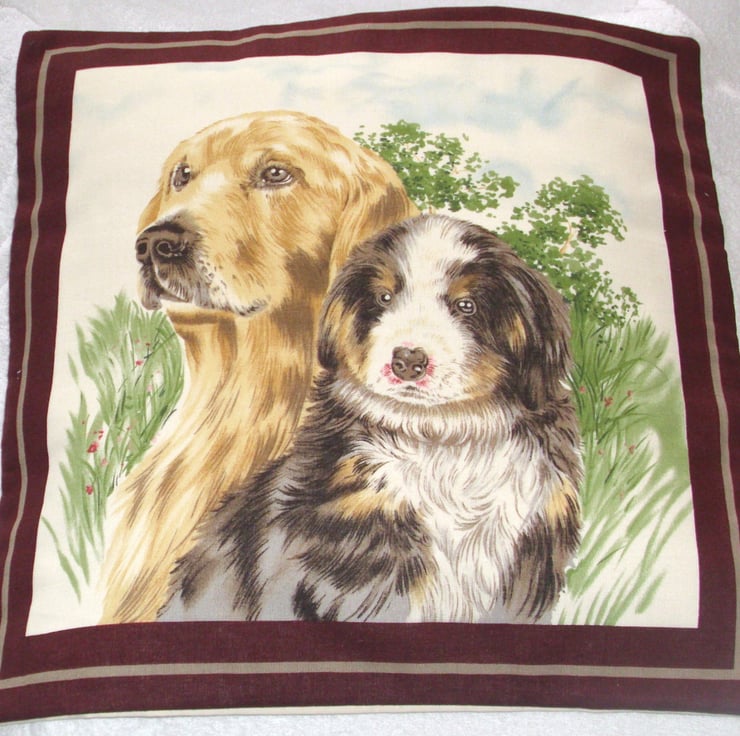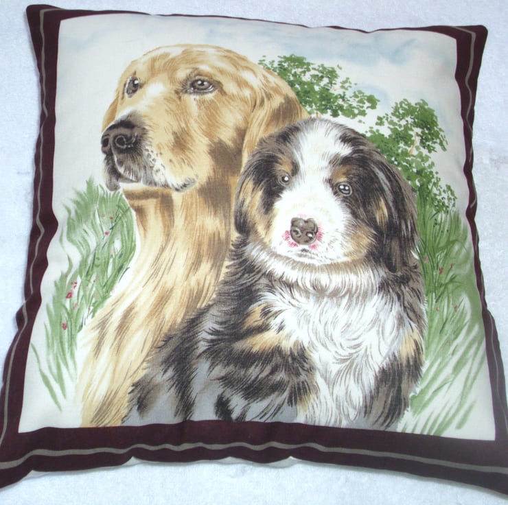 A square cushion of a lovely golden retriever and young friend sitting on the lawn in the garden waiting for some fun.