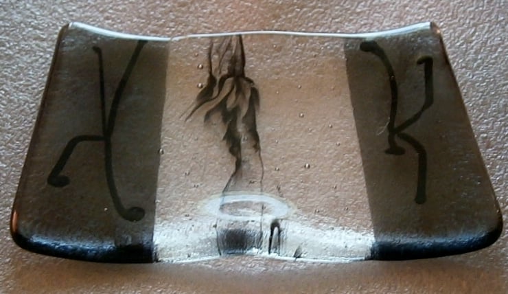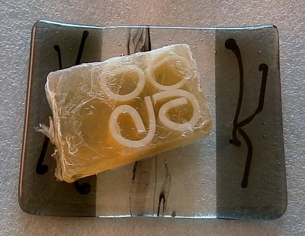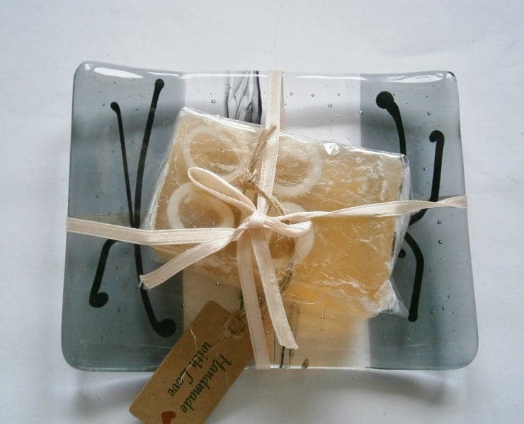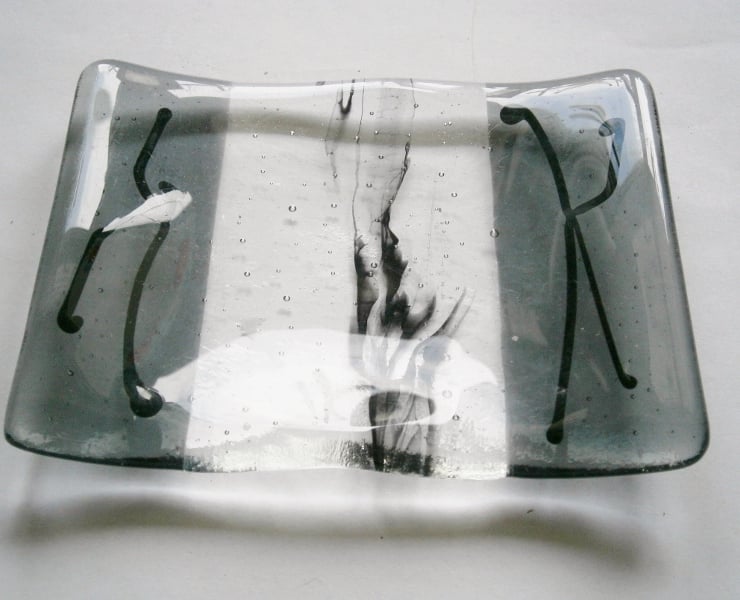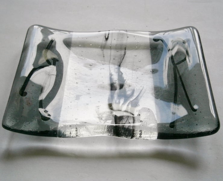 Hand crafted fused glass soap dish made with dark grey and clear glass with decorative black streaks. This beautiful piece measures approximately 9cm x 12cm, making it the perfect size for bathroom storage or as a trinket dish. Each soap dish comes with a piece of handmade soap, adding a touch of elegance to any room. Whether you're looking to enhance your bathroom's décor or seeking a unique gift, this handcrafted soap dish is sure to impress.