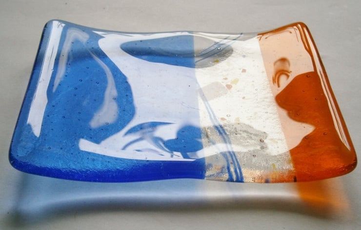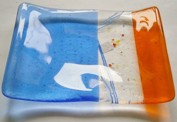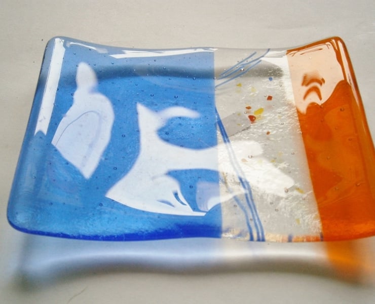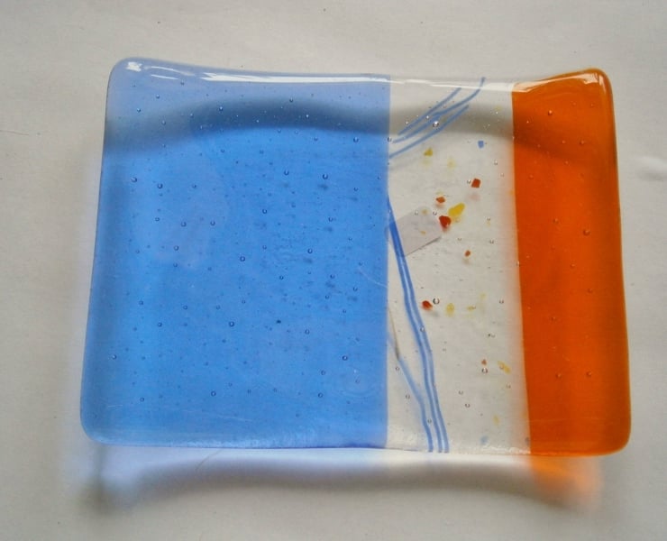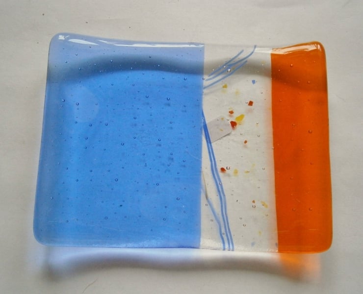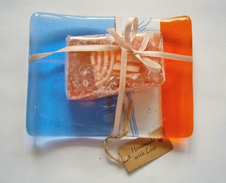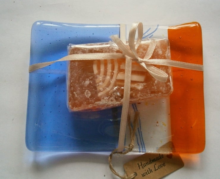 Add a touch of handmade charm to your bathroom! Our beautiful fused glass soap dish is crafted with blue, orange, and decorative glass.