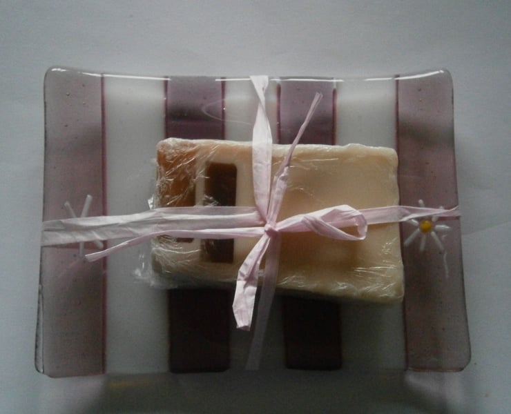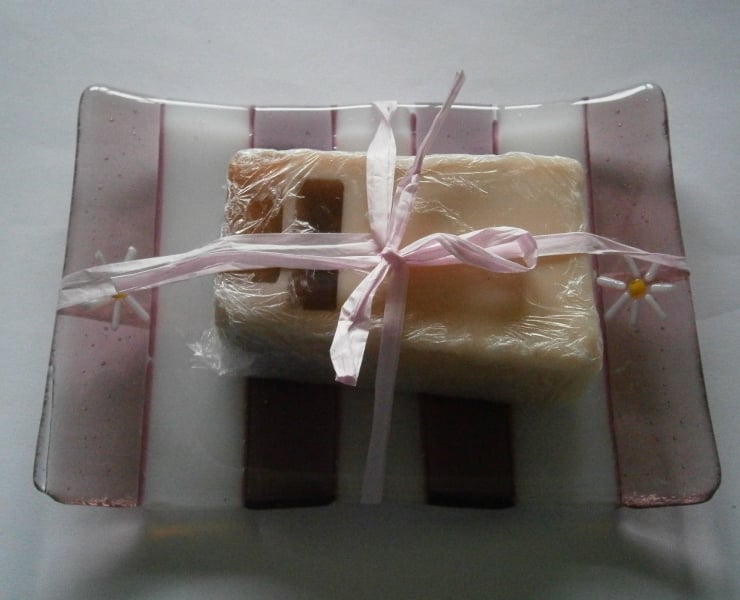 Fused glass soap dish made using plum and white glass with pretty daisy detail on each side