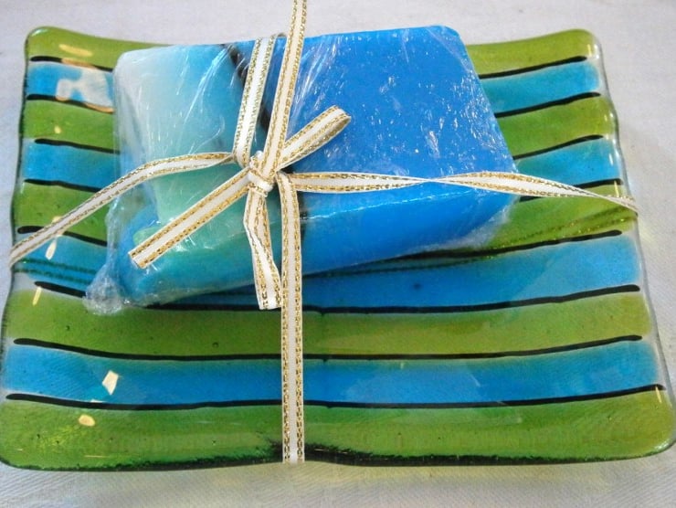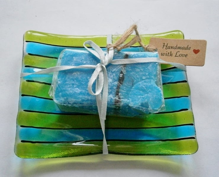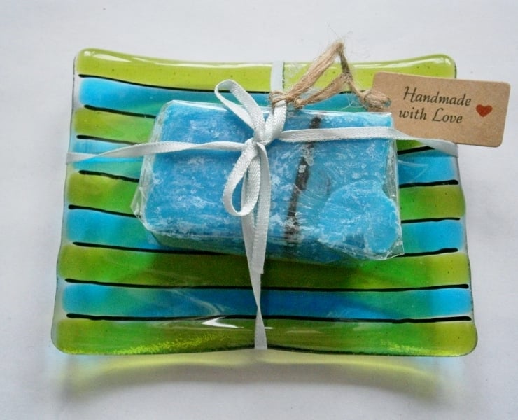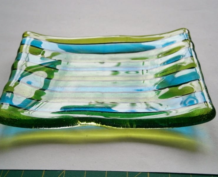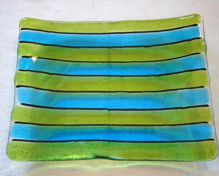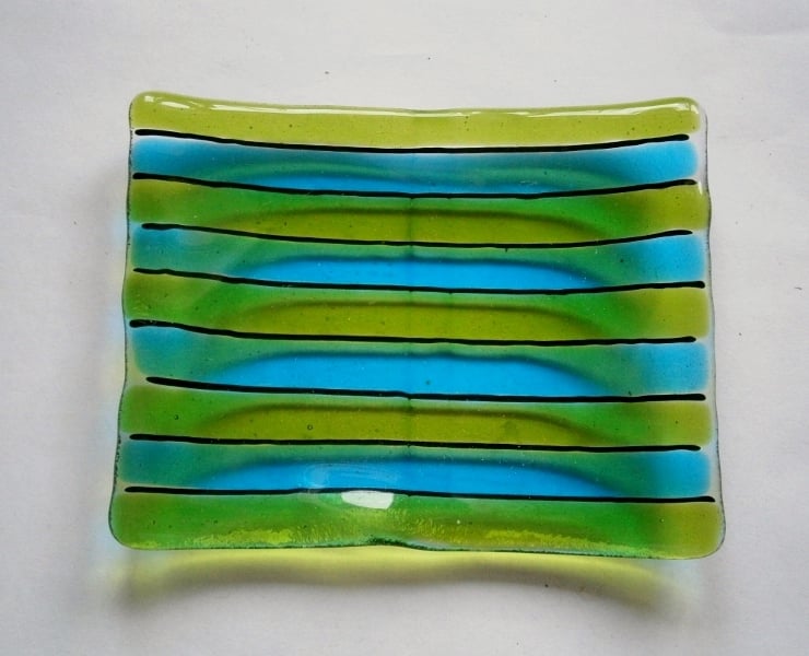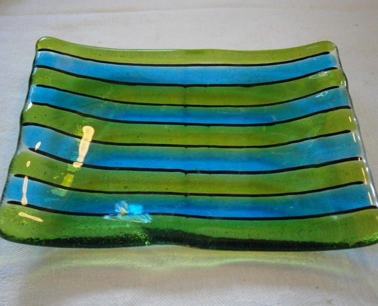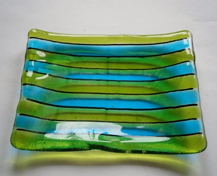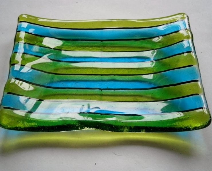 Fused glass soap dish made using turquoise and green glass arranged in pin stripes.