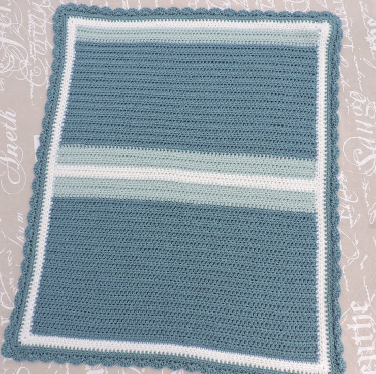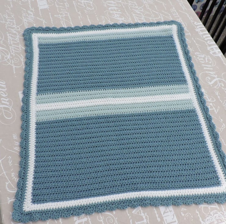 SALE was £8.50 now £6.00 I've crocheted this little blanket in a lovely soft premium double knit acrylic yarn. Petrel blue, pale duck egg blue and white. Finished with a wavy edging.