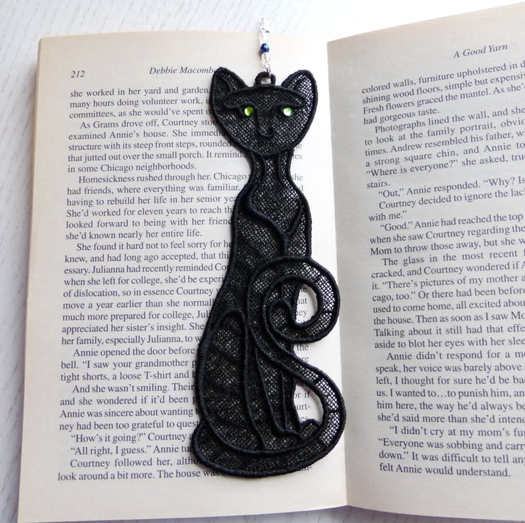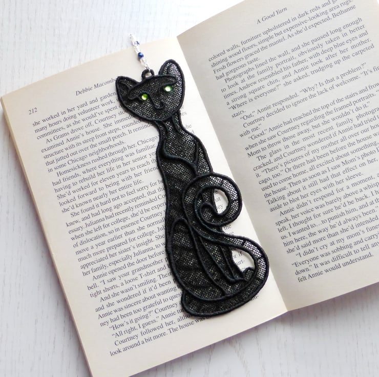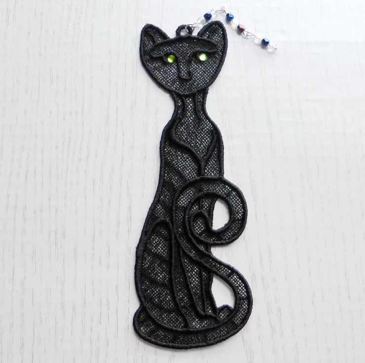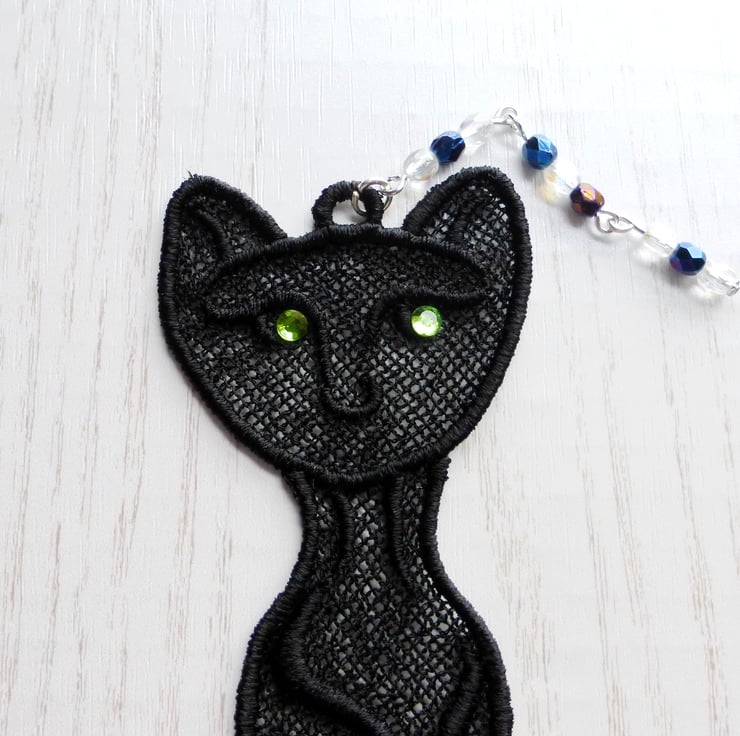 Made in black rayon machine embroidery thread with green sparkly eyes and a pretty bead charm.