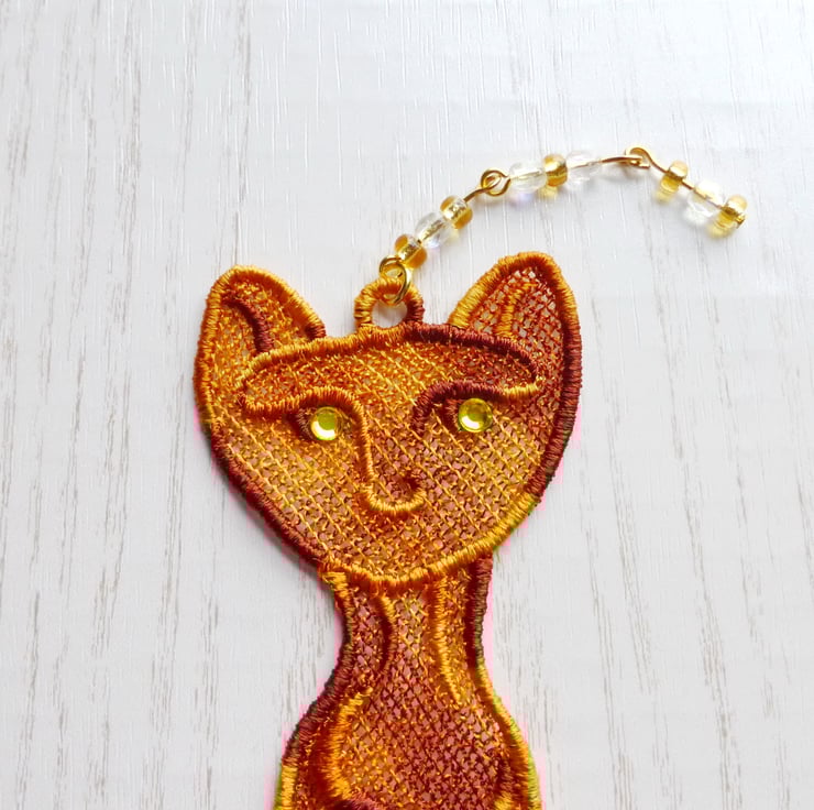 Made in golden coloured variegated rayon machine embroidery thread with sparkly eyes and a pretty bead charm.