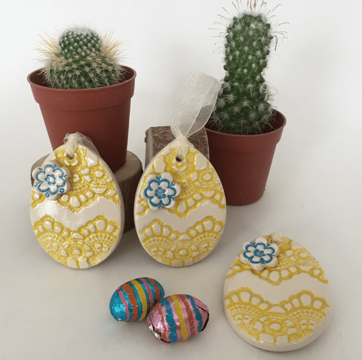 This cute little pottery Easter Egg decoration is hand cut from white earthenware clay, fired once, a rich glossy green glaze is applied and it is then fired again - so is nice and strong. This is the price for ONE egg. It measures 6.5cm x 4.5cm and hangs from a cream organza ribbon It is glazed on the front and left plain on the back.