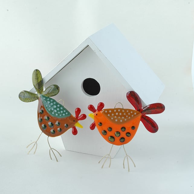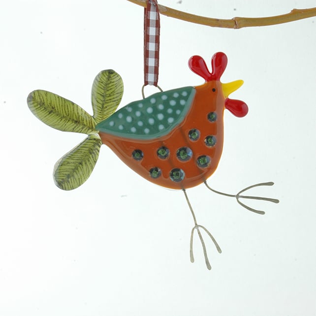 Created from layered Bullseye glass in my Whitstable workshop. The iridescent tail feathers have hand painted enamel detail. The body, wing, beak and tail feathers are all hand cut and fused in separate firings with the brass hanging wire. The feet are then soldered and hammered to shape. A brown gingham ribbon is attached to complete the design.