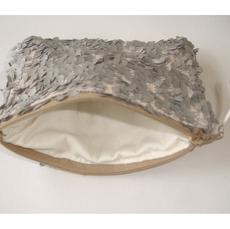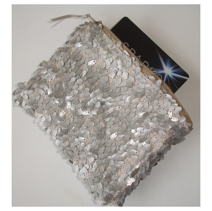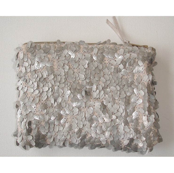 This zipped coin purse has been created with a tactile fabric covered in silver grey sequins .