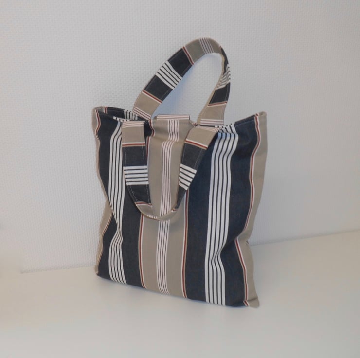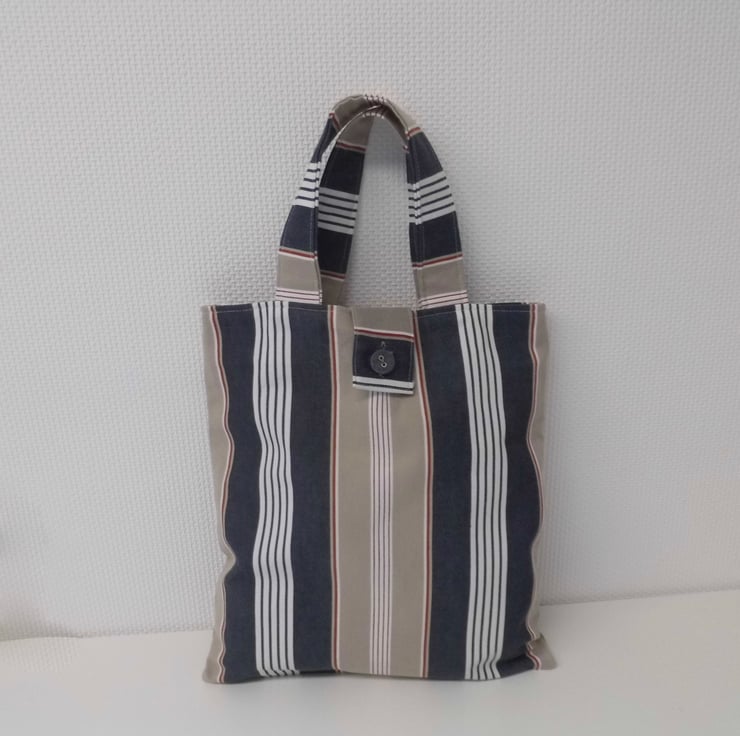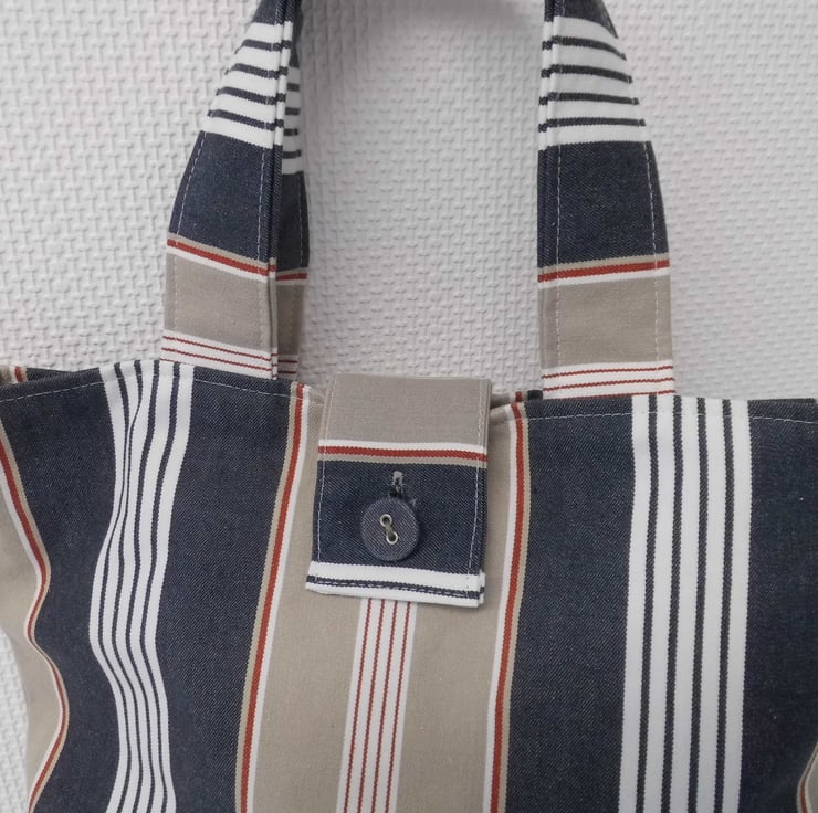 A tote bag made using a strong canvas style fabric in navy blue, red and white stripes.
