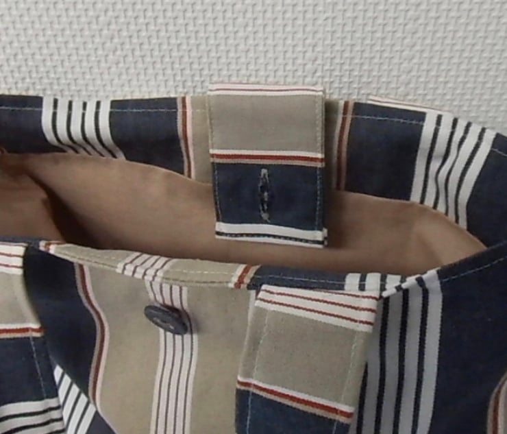 It has a flat the top with a buttonhole to fasten with the button on the front.