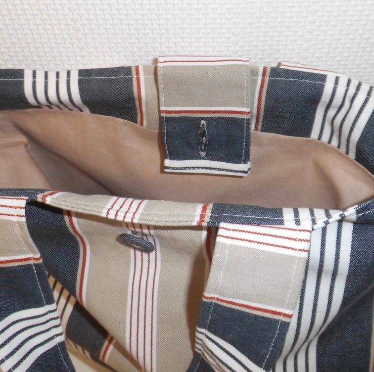 The fabric I have used for this tote used to be a huge cushion cover, but I had no use for it so have made a couple of bags, which meant I could also use the buttons and fastenings. Fabric is in perfect condition and lining fabric is new.