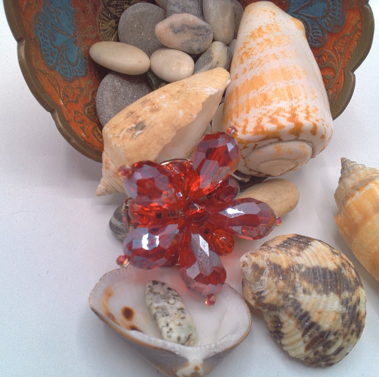 This pretty flower shaped brooch would go well with any of your Spring or Summer outfits worn everyday or for an evening out. It would also make an ideal gift for a friend or relative for a birthday or anniversary or it would make a lovely treat for yourself. The brooch is made by joining together large, approx. 20 x 10 mm, red crystal tear drop beads, and a round red crystal to form the flower shape and it is then attached to the silver plated brooch base.It is approx. 40 mm across. The brooch will be dispatched wrapped in tissue paper in an organza bag and delivered to you via Royal Mail first class post.