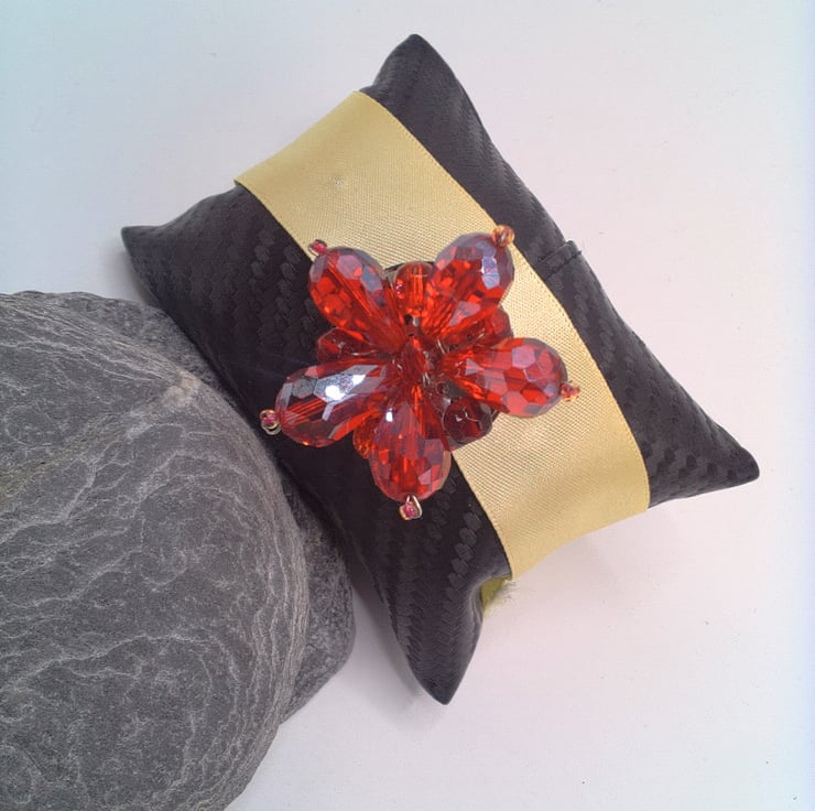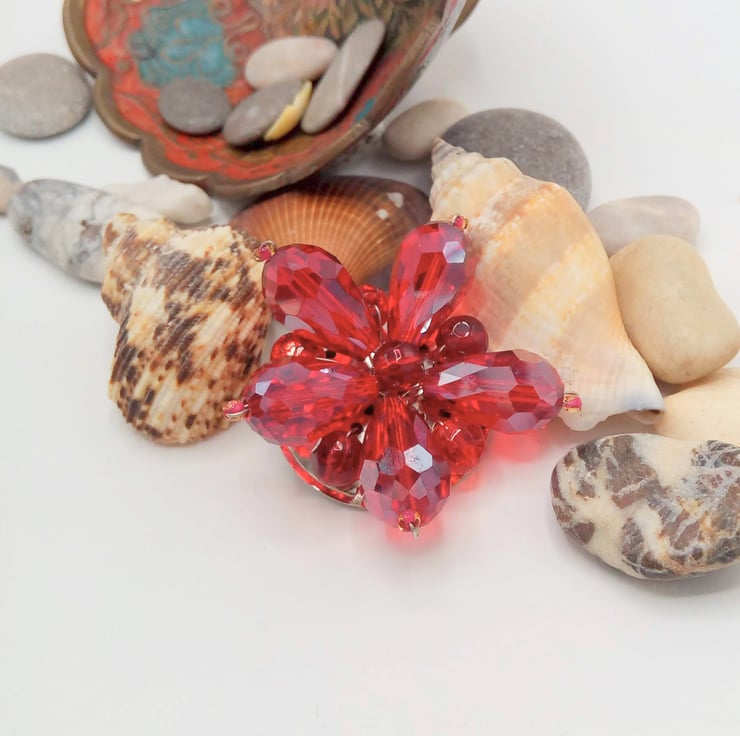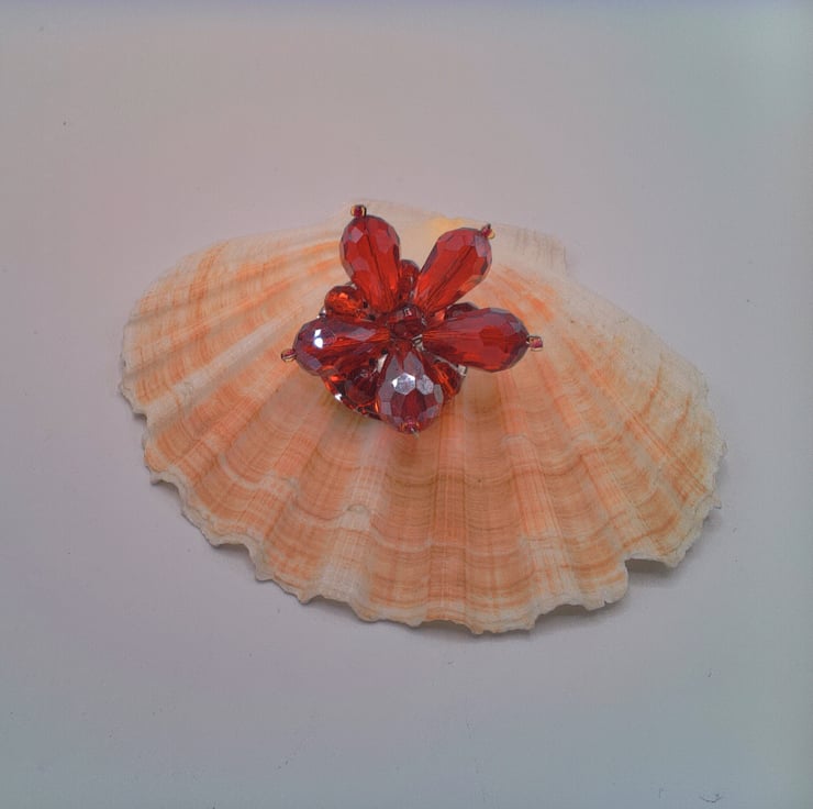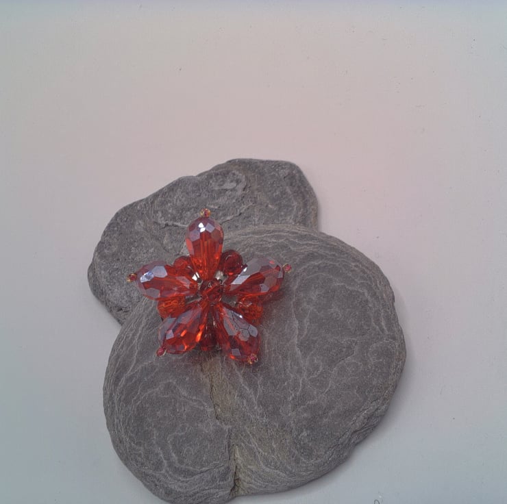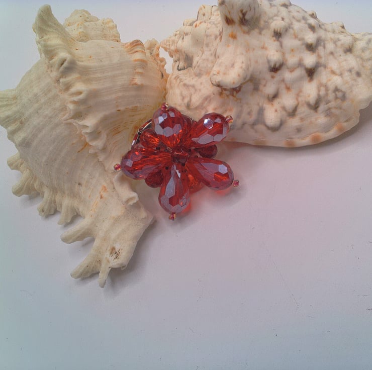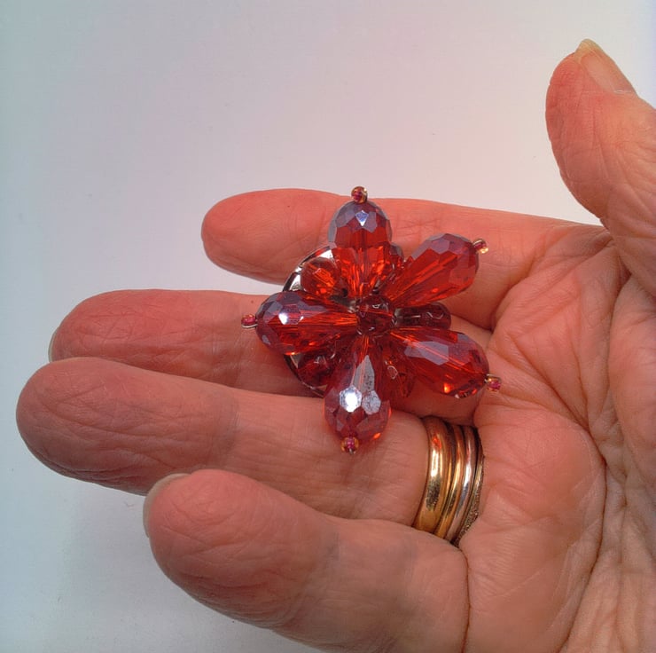 This pretty flower shaped brooch would go well with any of your Spring or Summer outfits worn everyday or for an evening out. It would also make an ideal gift for a friend or relative for a birthday or anniversary or it would make a lovely treat for yourself. The brooch is made by joining together large, approx. 20 x 10 mm, red crystal tear drop beads, and a round red crystal to form the flower shape and it is then attached to the silver plated brooch base.It is approx. 40 mm across. The brooch will be dispatched wrapped in tissue paper in an organza bag and delivered to you via Royal Mail first class post.