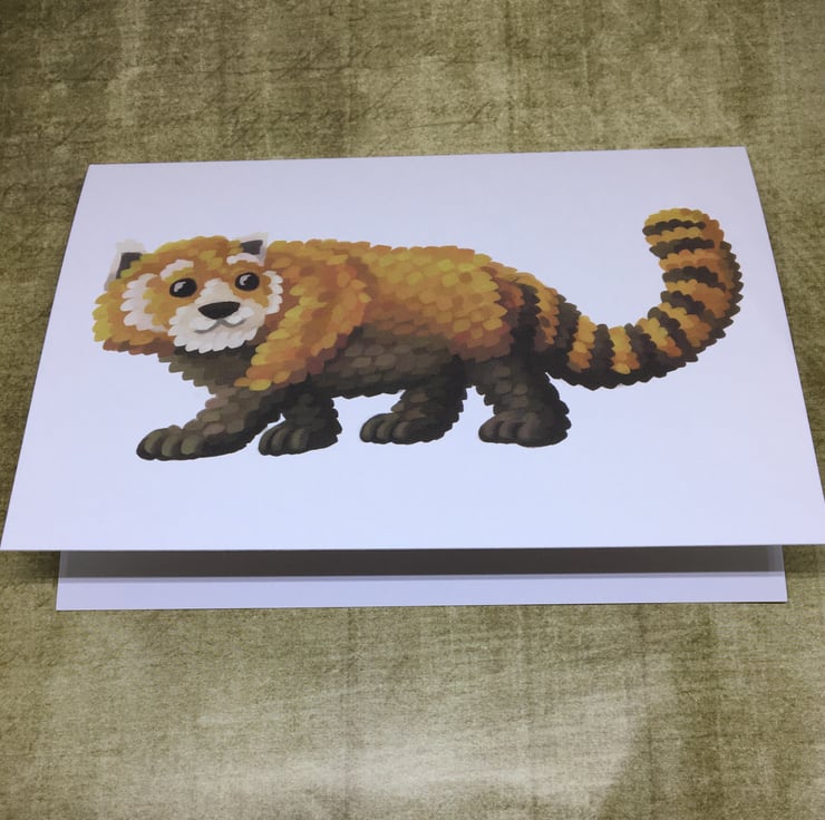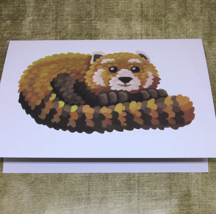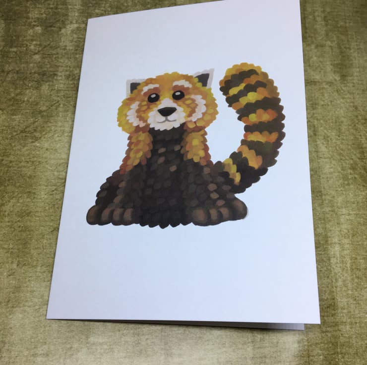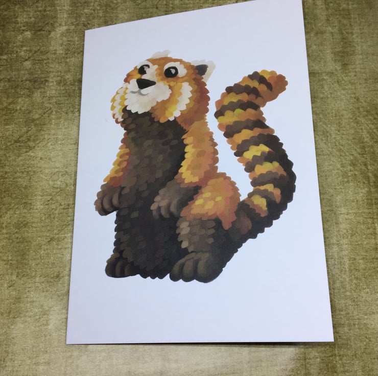 A red panda blank greeting card by DuffleCat Prints (Damian Case). Front of card with design on is Gloss coated. Back of card is blank and uncoated for your message. 127mm x 177.8mm. 330gsm card stock.