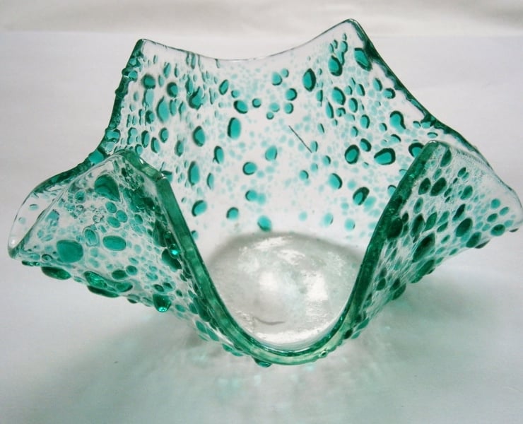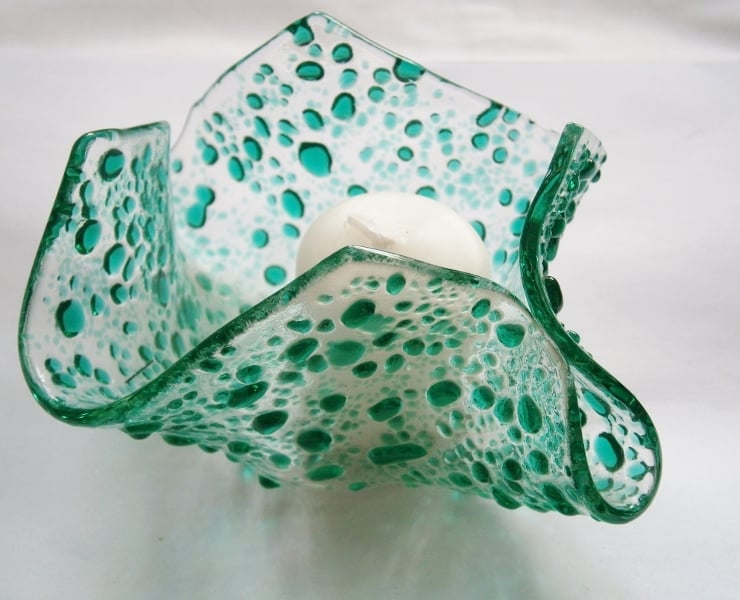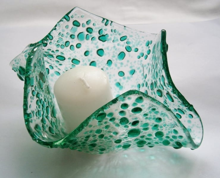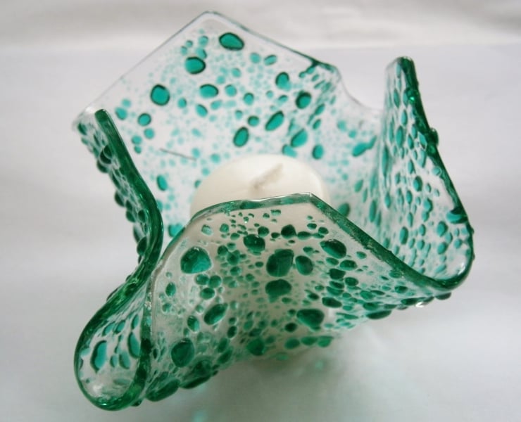 Fused glass clear and teal speckled glass candle or tea light holder