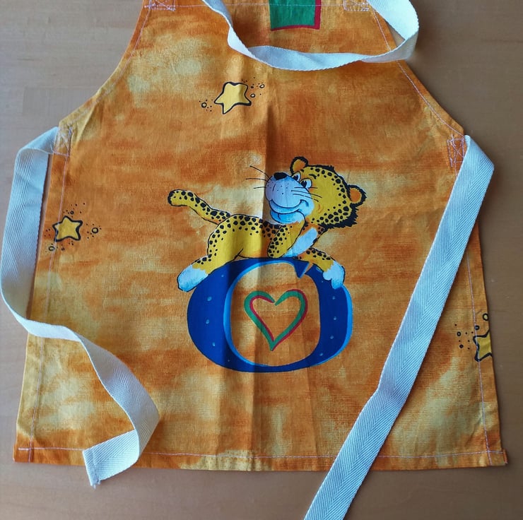 This is a lovely bright orange pinny with a smiling leopard lying on a blue O with a green heart in the centre. It would be ideal for a child whose name begins with O. I have made it of a good quality machine washable cotton, with acrylic webbing straps. It measures approximately 17" (43 cm.) from neck to hem, and 14" (36 cm.) at the widest point, and will fit a child from about 2-6 years. The child, wearing a different apron in the photo, is three years old.