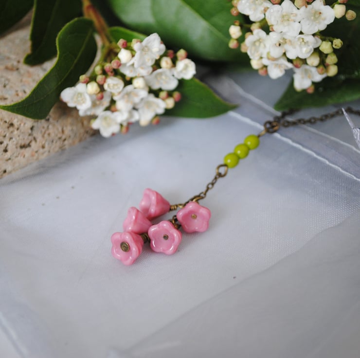 This necklace is made with an antique brass chain fastened with a matching lobster clasp and has a cascade drop of a cluster of pink flowers. It is finished with chartreuse green beads as a contrast. A necklace that is one-of-a-kind.