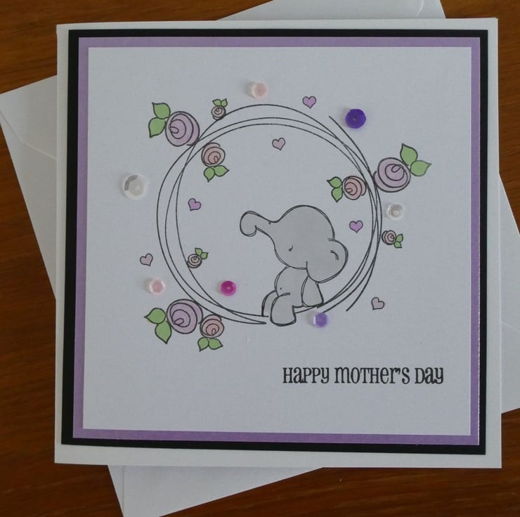 It features an elephant sitting in a wreath decorated with roses and hearts and finished with sequins.