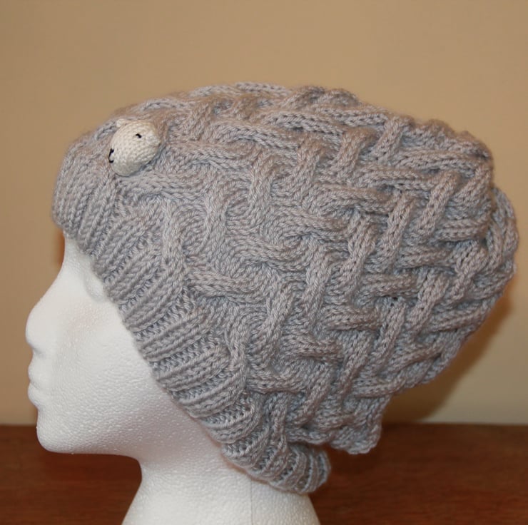 A gorgeous soft hand knitted light grey beanie with my unique sheepie head adornment. Knitted in easy wash acrylic yarn that is soft & durable.