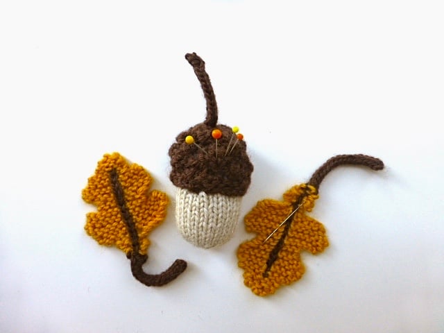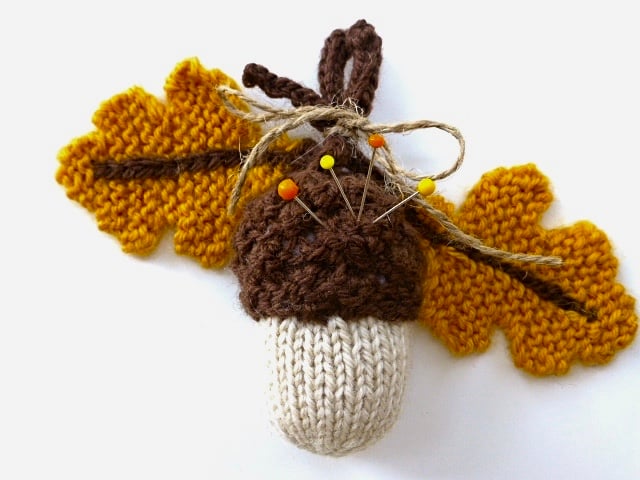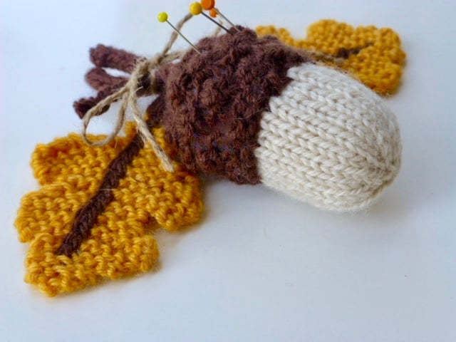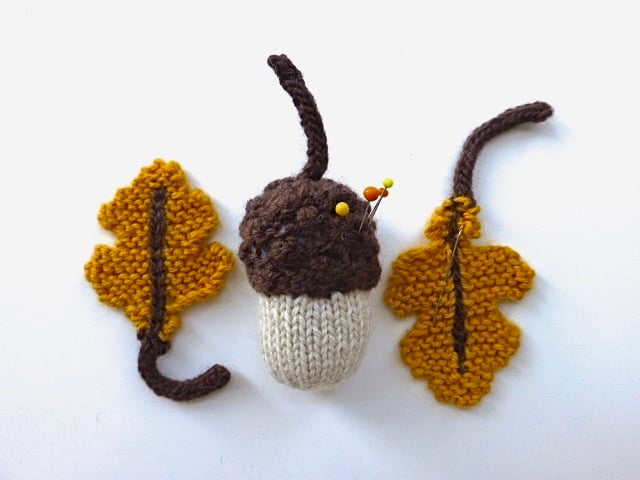 This cute, knitted pincushion comes with an acorn and separate oak leaves. It makes up a handy layered sewing set.