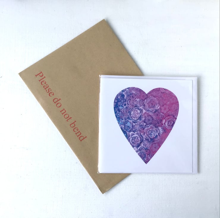 A printed greetings card based on an original silk painting of mine with a floral theme. It measures approximately 145mm x 145mm square and is printed on 300gm responsibly sourced card. There is a quality envelope and a cello wrapper. This card is will be sent in a card backed envelope for protection.
