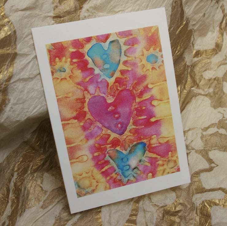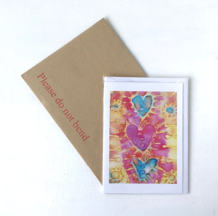 Based on an original silk painting of mine, this rectangular printed greetings card measures approximately 175mm x 125mm and is printed on responsibly sourced cardboard. It has a quality white envelope and a cello wrapper. This card will be sent in a card backed envelope for protection.