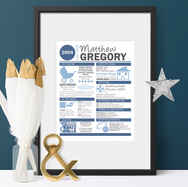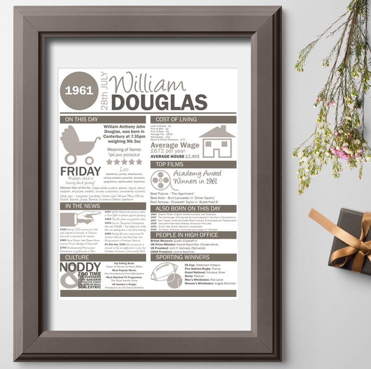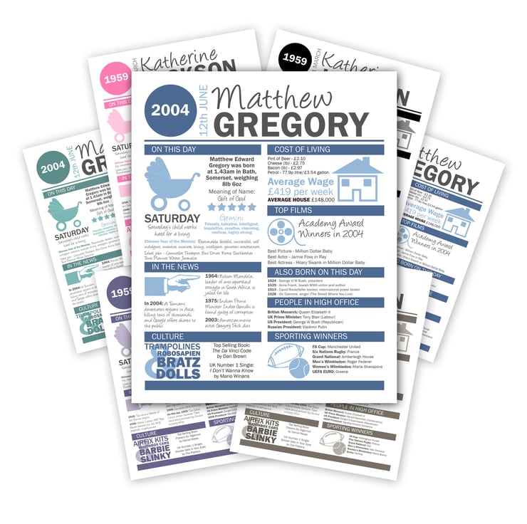 What was happening in the world on the day you were born? This personalised Birthday print is meticulously researched to unearth all the important events, facts & figures relating to the day of your birth. A fascinating memento for all ages from adults to babies.