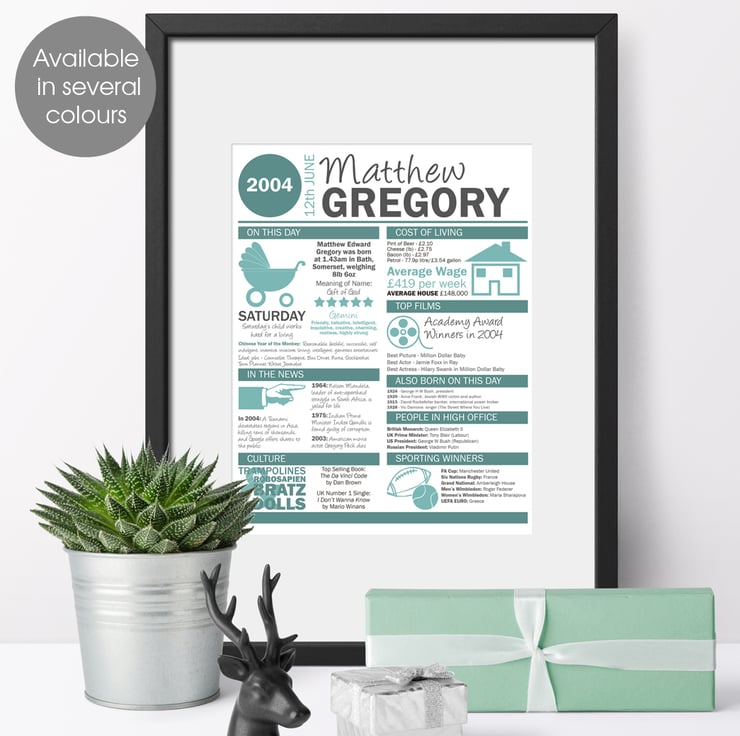 Available in a choice of colours, you can request any date from 1900 onwards. This unique, highly personal print makes a lasting keepsake for him or her, grandparents or parents, babies or a christening gift.
