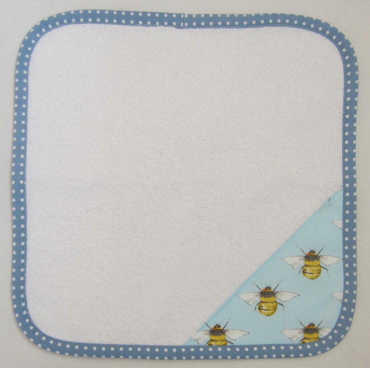 Matching white towelling face cloth or dribble cloth edged with blue and white spotty bias binding.