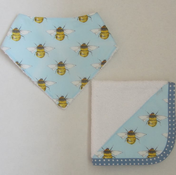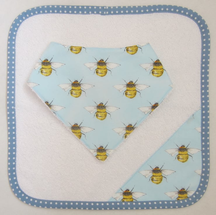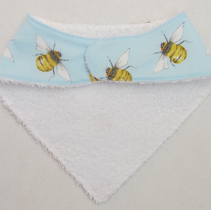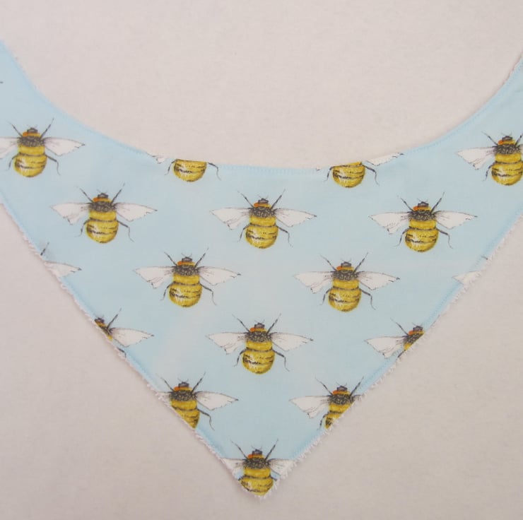 Babies bandana bib in pretty blue bee fabric, backed with soft white towelling for extra protection. At the back there is a 3.5 cm velcro fastening to give a good fit.