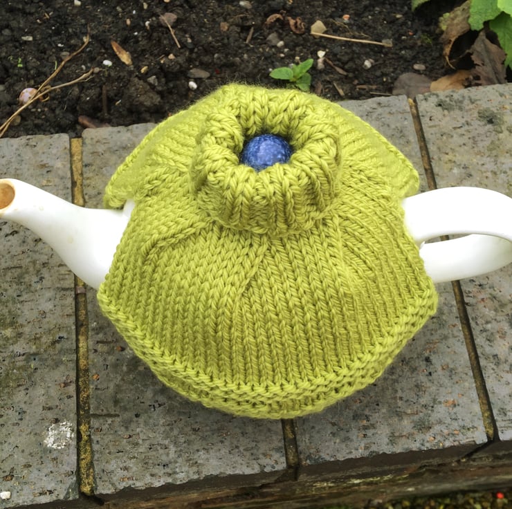 A hand knitted lime green merino wool tea cosy that has a lovely leaf design pattern running around the middle and a ribbed polo neck top.