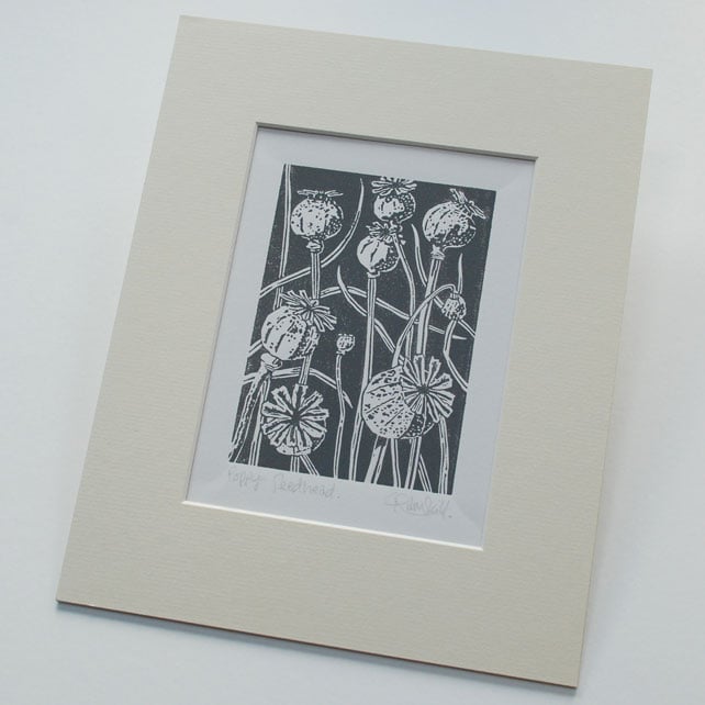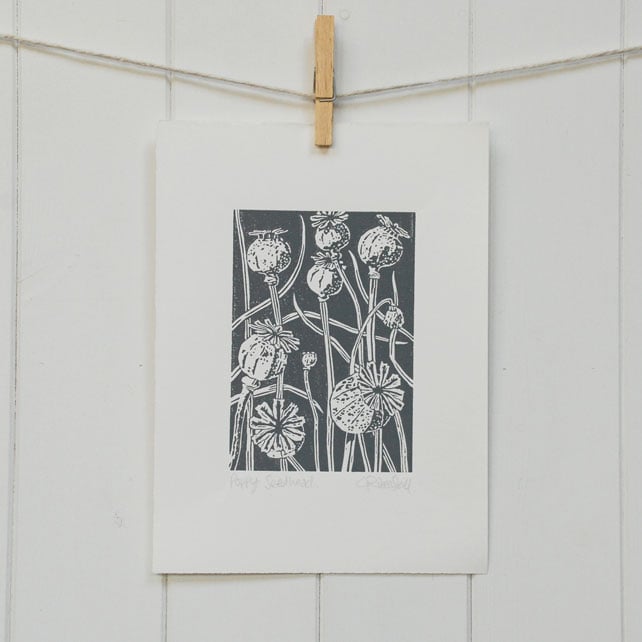Poppy Seedhead charcoal grey - Linocut Print