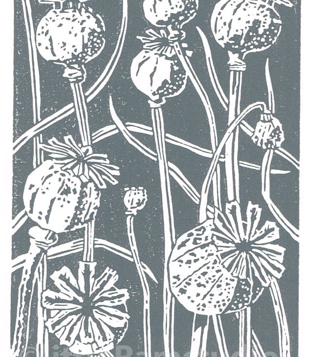 Poppy seed head charcoal grey - Linocut Print.