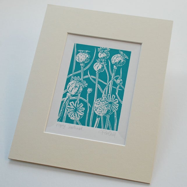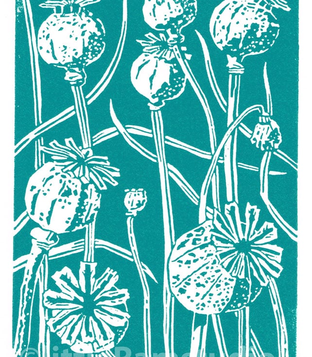 Poppy seed head in dark cyan - hand cut Linocut Print.