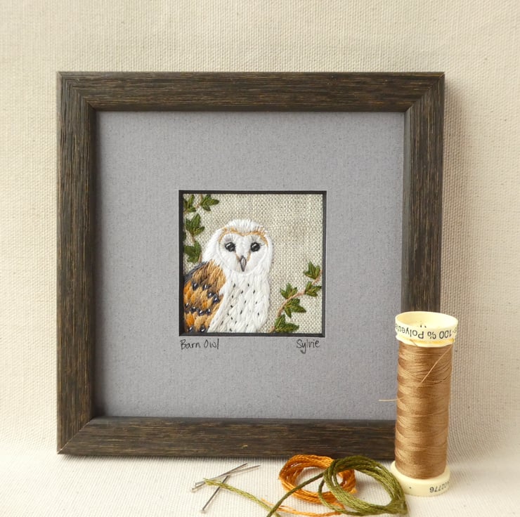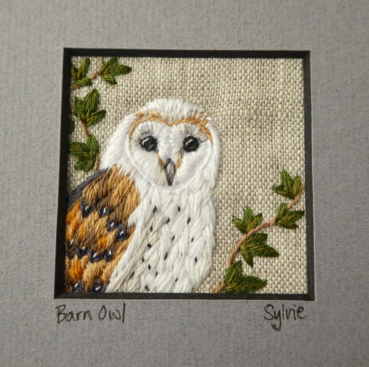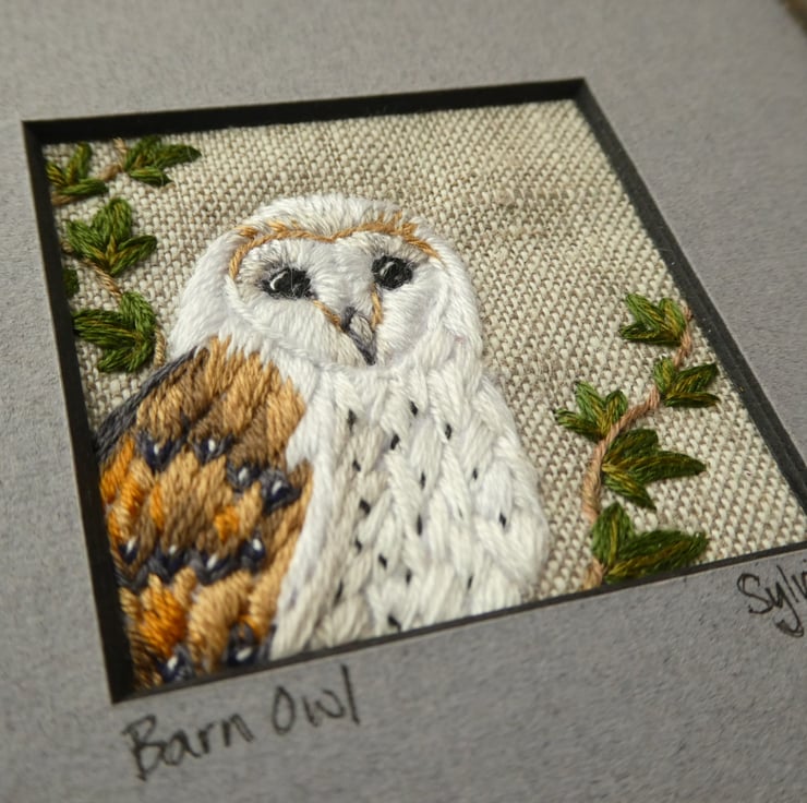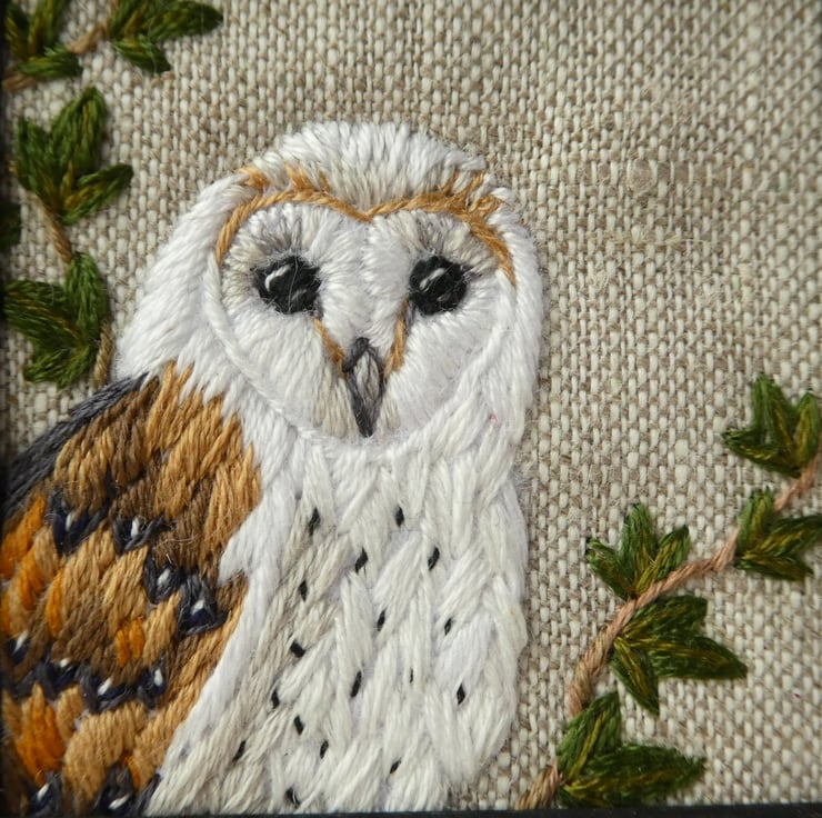 Embroidered by hand, fabric picture of a Barn Owl