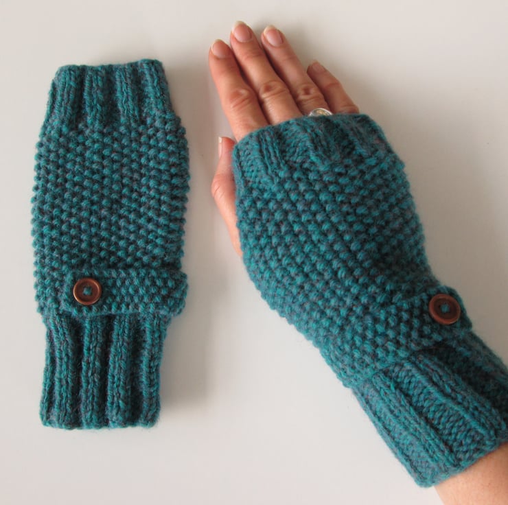 These deep teal green fingerless mittens / wrist warmers / gloves are knitted in a rib and moss stitch pattern and are hand knitted in a lovely and warm Aran wool, which comprises of 25% pure wool and 75% acrylic wool.