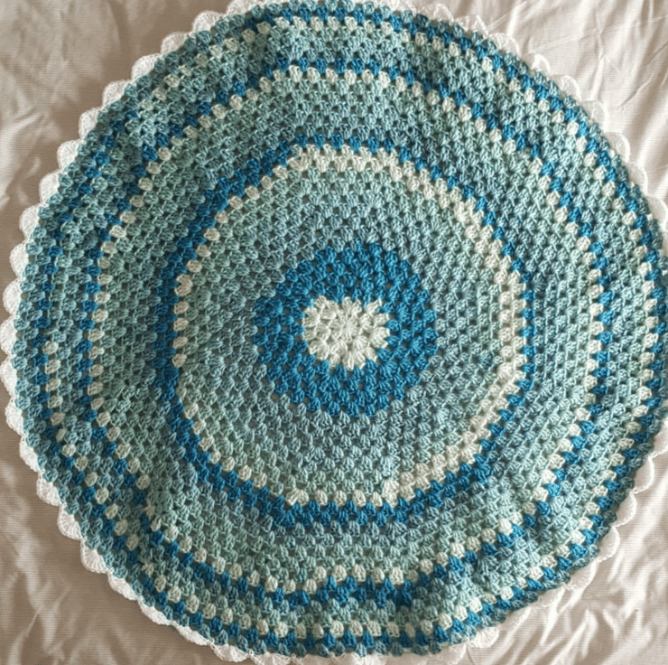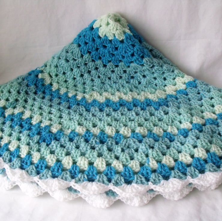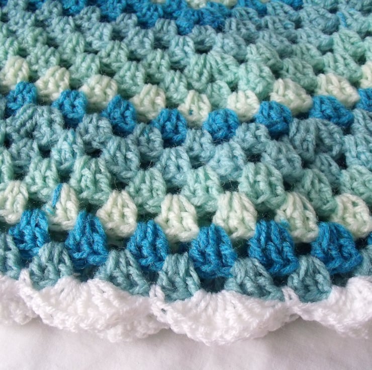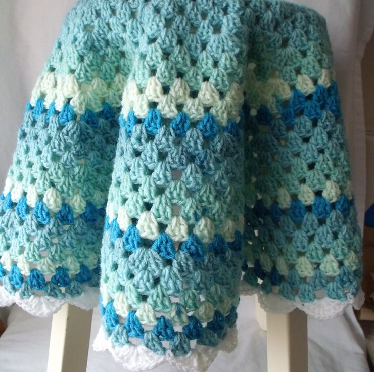 I've used acrylic variegated yarn cakes for this blanket, so the colours don't come out evenly which makes each one unique. I've edged it with white yarn.