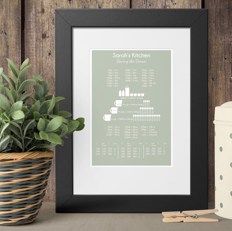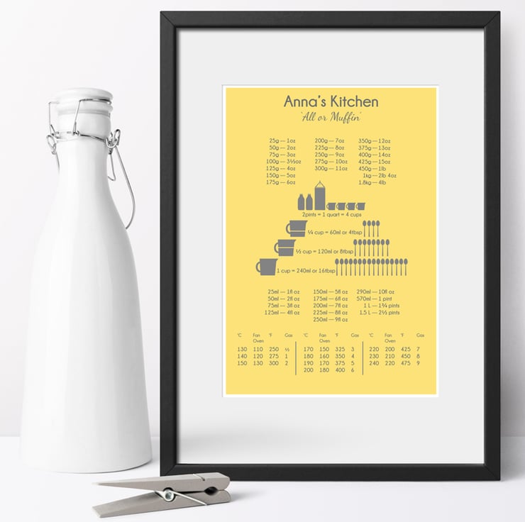 Featuring conversions for weight, oven temperature, liquids, cups and metric to imperial conversions, this will make a great gift for a foodie, cook or baker. This smart and stylish personalised print will grace the kitchen wall and means there’ll be no more scouring cookbooks or getting flour on your phone while you google how many American cups are in a pint!